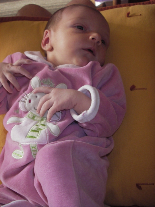 Voila presque 2 mois qu’elle comble nos jours et sonorise (parfois) un peu nos nuits.Elle a vu le jour le 25 juillet 2006, il faisait beau, chaud, elle était pressée de sortir. Un accouchement très rapide merveilleusement bien géré par son père, mais qui a quand même fait un peu souffrir sa pauvre mère.Mais tout