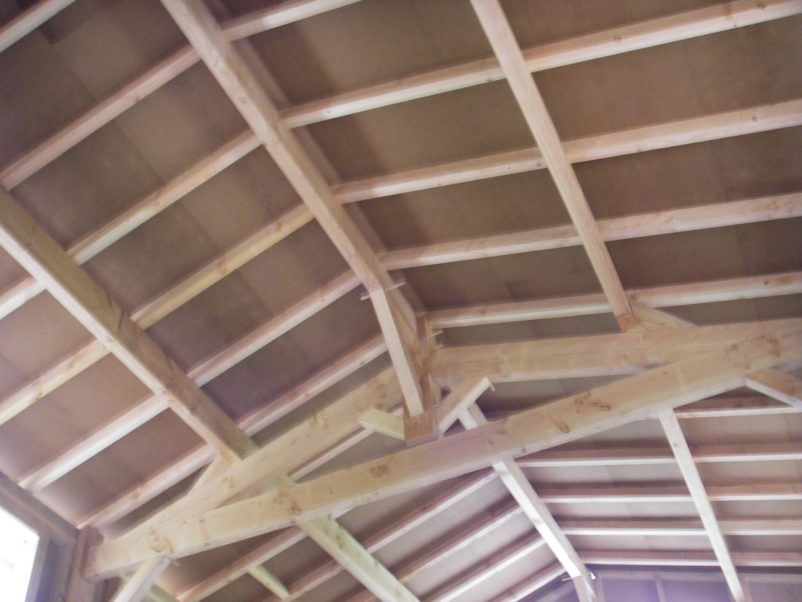Vendredi la pose du panneau pare-pluie de sous-toiture était terminée, ainsi que toute la volige. Les descentes ont été positionnées et une partie des goutières posées. Le lattage et contrelattage n'est pas terminé. Mercredi on devrait voir se poser les premières tuiles.