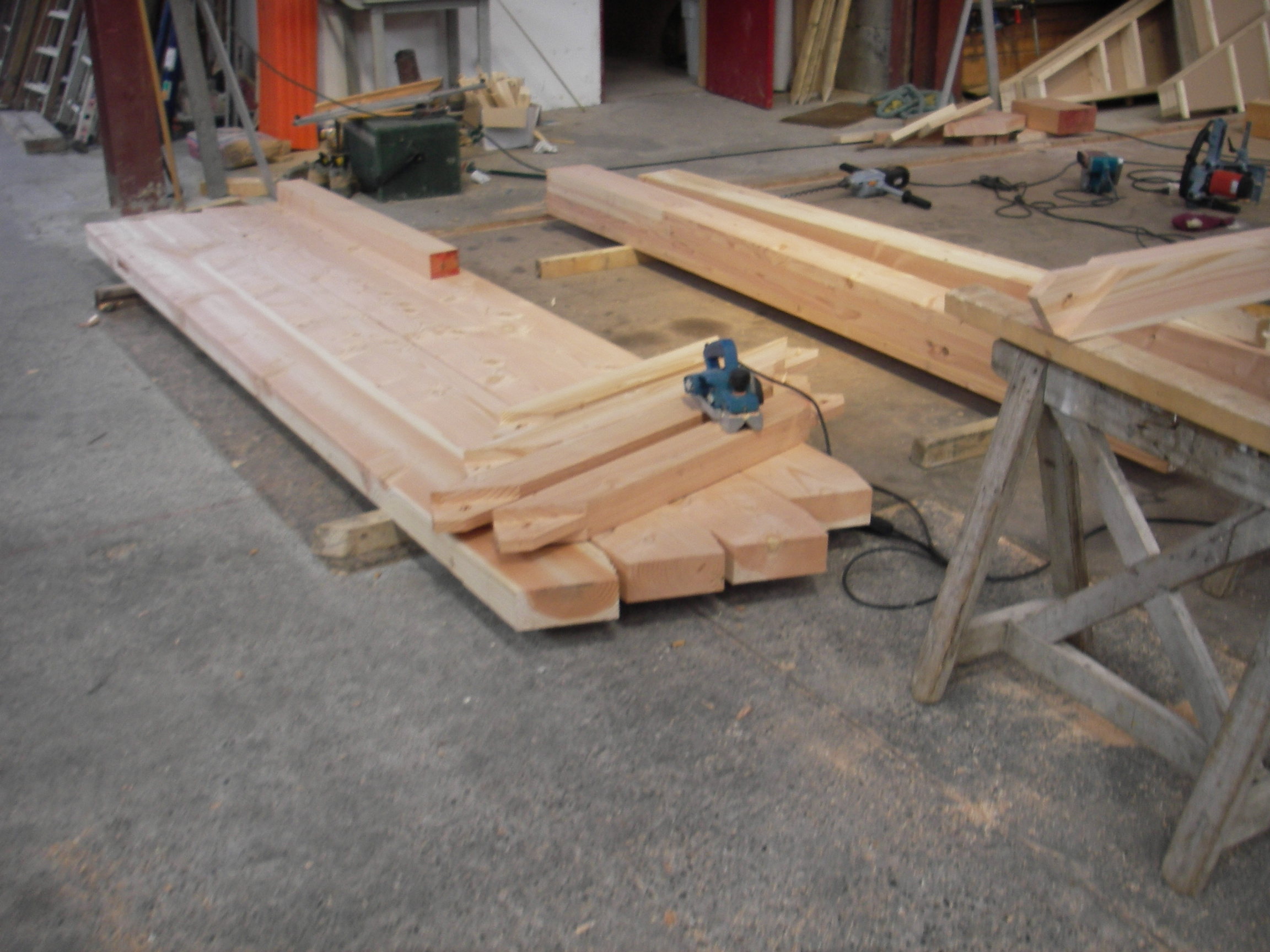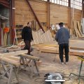 On distingue des pignons contre le mur de l'atelier, un tas de murs et quelques poutres.