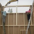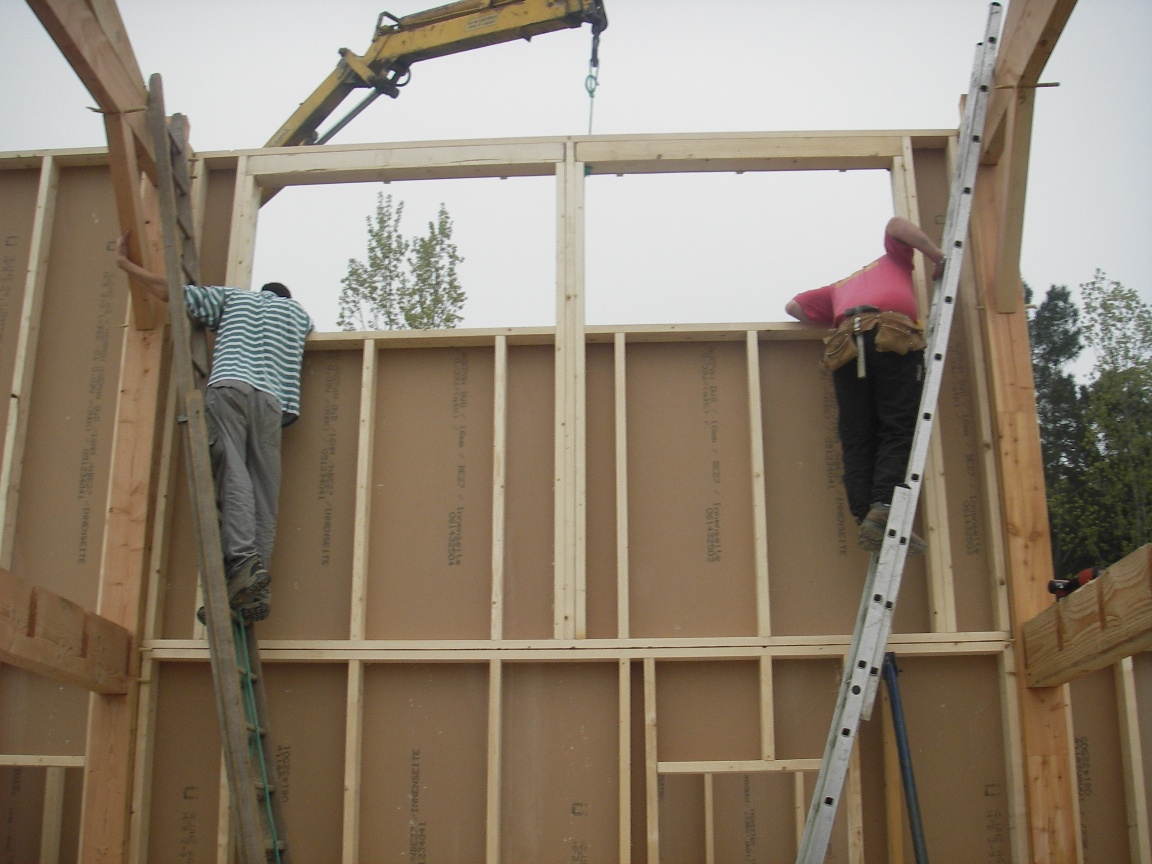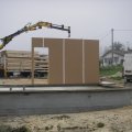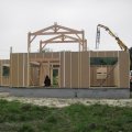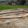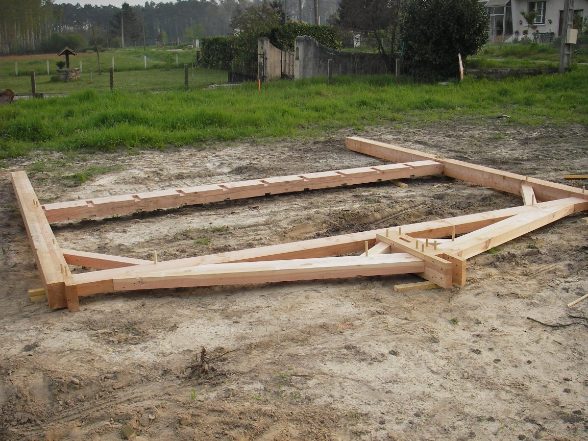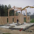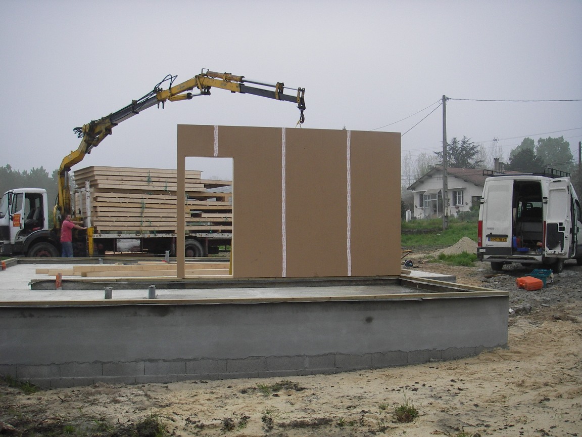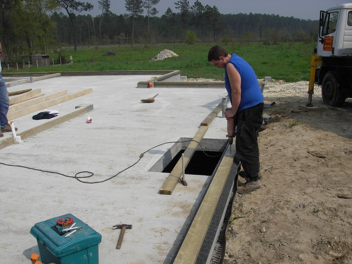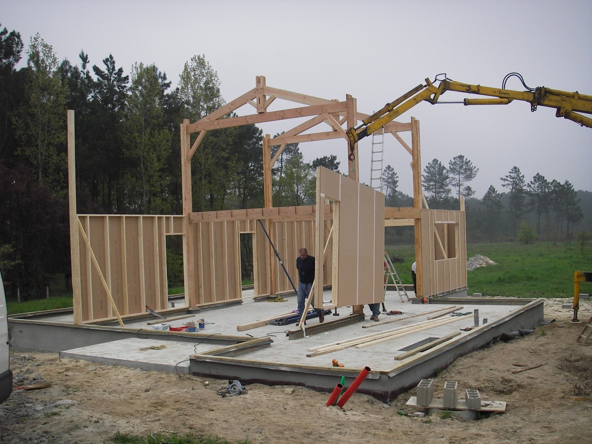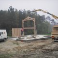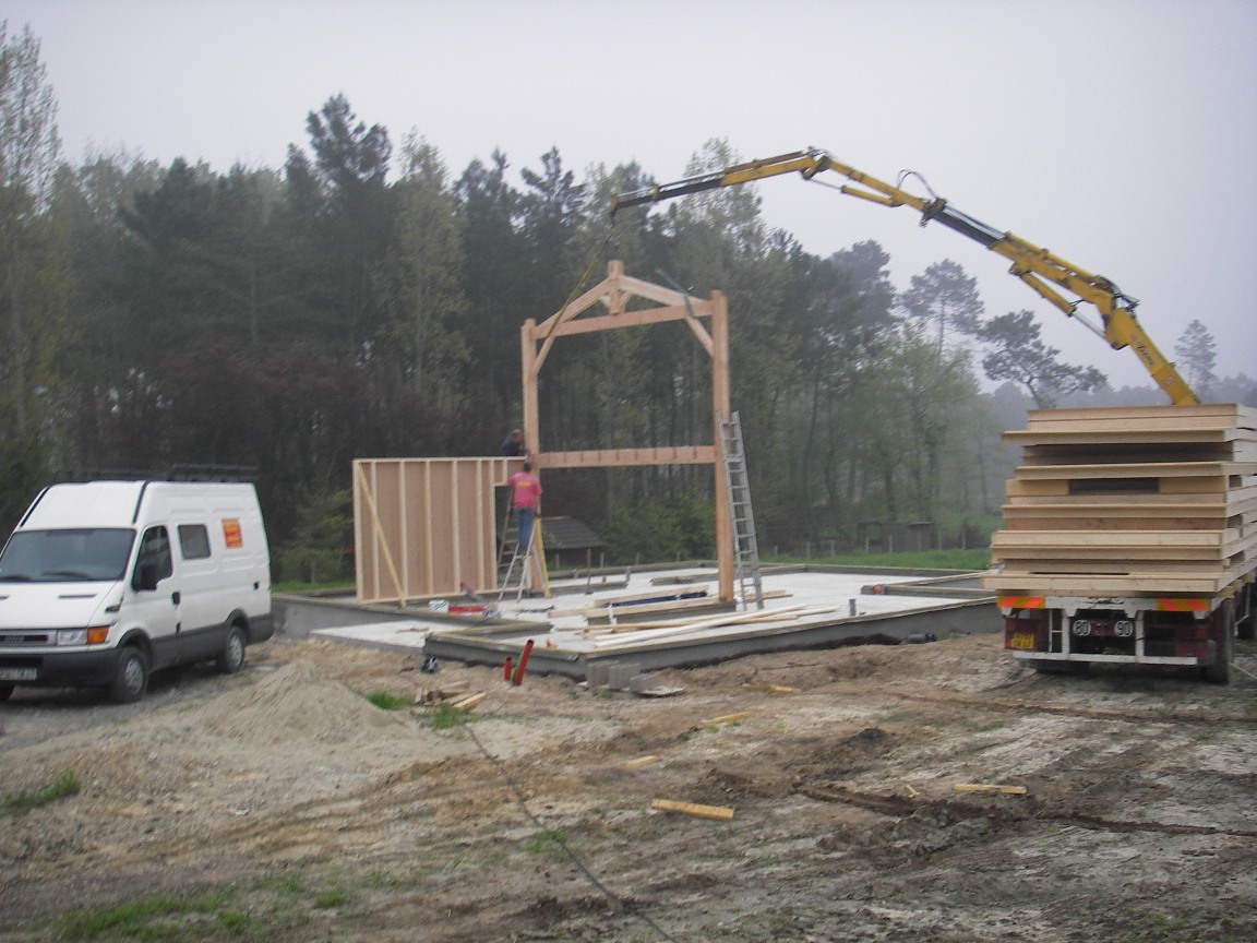ça a commencé lundi après-midi (16/04): "Ils" débarquent à trois pour poser les lisses basses, prémonter quelques éléments de charpente et préparer la pose des murs le lendemain.