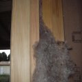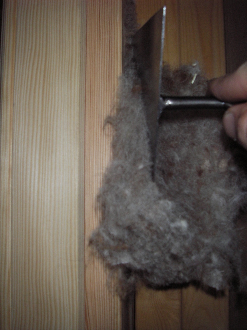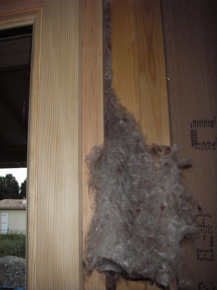 Le soir venu je repasse à la maison pour parfaire l'isolation sur le pourtour des fenetres : Insertion de laine de mouton bien tassée dans tous les jours. Du silicone viendra étanchéifier tout ça à l'interieur et à l'extérieur.